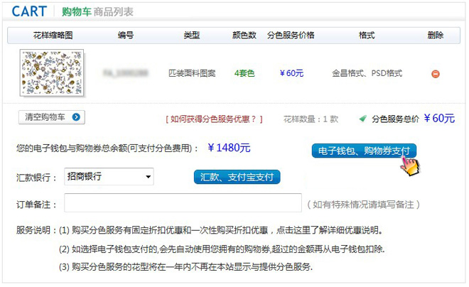 第二步,在購買花型的分色服務時選擇‘電子錢包、購物券支付’即可以使用購物券來結算。
