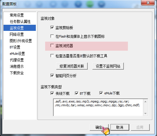 :把紅色部分‘監視瀏覽器’選項前面的正方形保持未選擇狀態如下圖,然后點擊最下面的‘確定’按鈕,完全退出迅雷軟件,重新點擊‘源文件下載’按鈕即可完成下載操作。