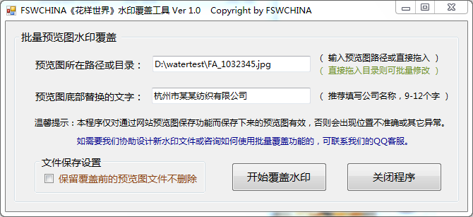 如預(yù)覽圖的水印對您給客戶挑選花型時帶來不便,可使用我們下面提供的批量水印覆蓋工具來使用您們特有的水印.