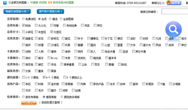 在‘會員匹裝圖案’里面找‘風格時尚’、‘尺寸比例大’適合用于‘連衣裙’并且花樣顏色數在‘4-7’個之間的‘抽象花’,結果按‘推薦程度’降序來排序。