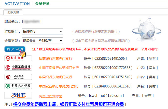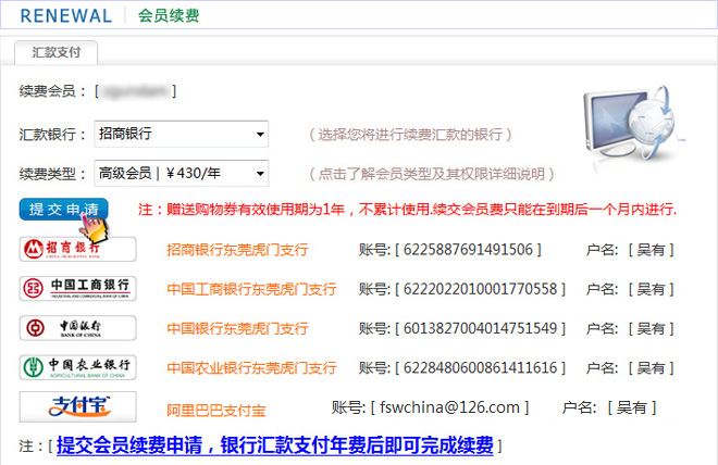 :選擇匯款的銀行及續費的會員類型,點擊‘提交申請’并把款項匯款到指定的銀行賬號,匯款繳費后可通過電話、短信或QQ等方式通知我們,我們確認款項后即可馬上為您續費并重新開通會員。