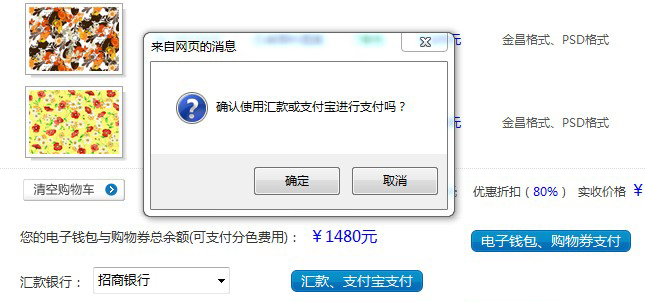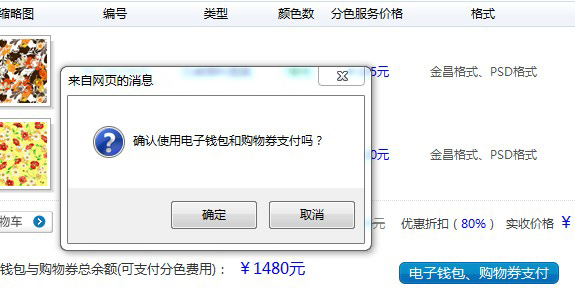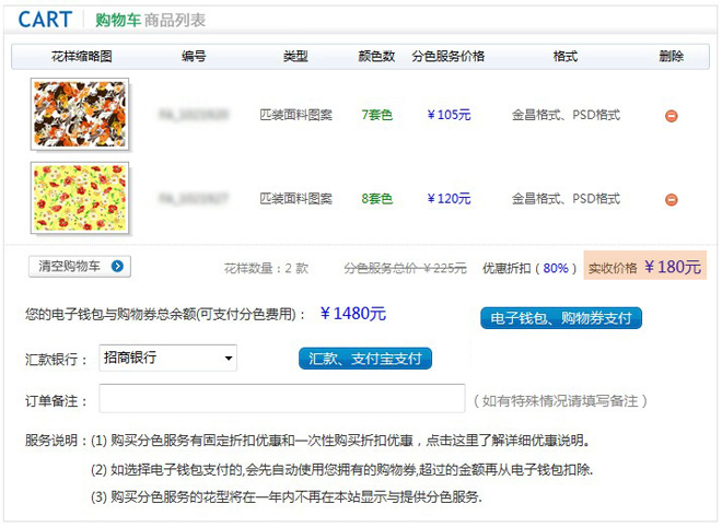 第三步,進入購物車后可瀏覽到您選擇需要提供分色服務的花型及費用信息,同時可以選擇‘電子錢包、購物券支付’或‘匯款、支付寶支付’。