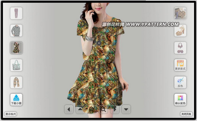 為了體現(xiàn)不同的面料花型、印花圖案在服裝、家紡、圍巾、箱包、泳裝、床品、鞋子的真實(shí)試衣感覺(jué),我們都希望有一款軟件可以模擬花型在產(chǎn)品上的真實(shí)感覺(jué)。另外,通常我們都需要幾套配色進(jìn)行打樣,所以我們希望這款軟件/工具能夠?qū)崿F(xiàn)試衣套款、配色這兩大功能。 目前,市面上還沒(méi)有一款簡(jiǎn)單易操作、能結(jié)合套款和配色的軟件給我們使用。有見(jiàn)及此,源創(chuàng)花樣網(wǎng)研發(fā)了簡(jiǎn)單易用的試衣套款、在線配色的功能,滿足廣大客戶對(duì)花型試衣套款、配色的需求。該試衣套款、在線配色的功能,除了我們【源創(chuàng)花樣網(wǎng)】www.ypattern.com 10多萬(wàn)款花型可以自主隨意套款配色外,客戶還能上傳自有的花型,進(jìn)行在線的試衣套款、配色。效果圖還可以下載。而且,最重要的是,這么好用的工具,竟然是:免費(fèi)!免費(fèi)。∶赓M(fèi)。。。ㄖ匾氖虑檎f(shuō)3遍。)