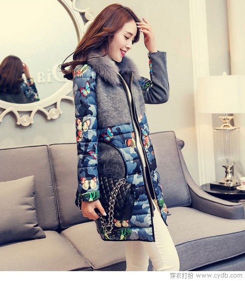 蝴蝶飛來了,落在了一直不起眼的羽絨服上,讓人覺得冬天不那么無聊。貂絨拼接,高級灰期待你的別樣演繹。迷彩印花的方式改變了色彩,藍色系似乎更加溫婉,與蝴蝶翩翩飛舞的情愫遙相呼應。
