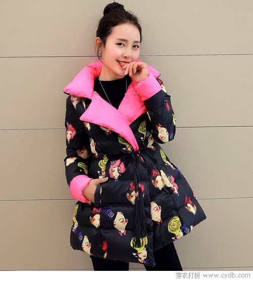 印花的花可不僅僅包括是花朵哦,愛上印花就是因為這些繽紛絢爛的多種可能。人物印花可以大氣也可以俏皮可愛,讓黑色的厚重不再成為問題,大翻領融合撞色,深冬與初春的碰撞躍然紙上。