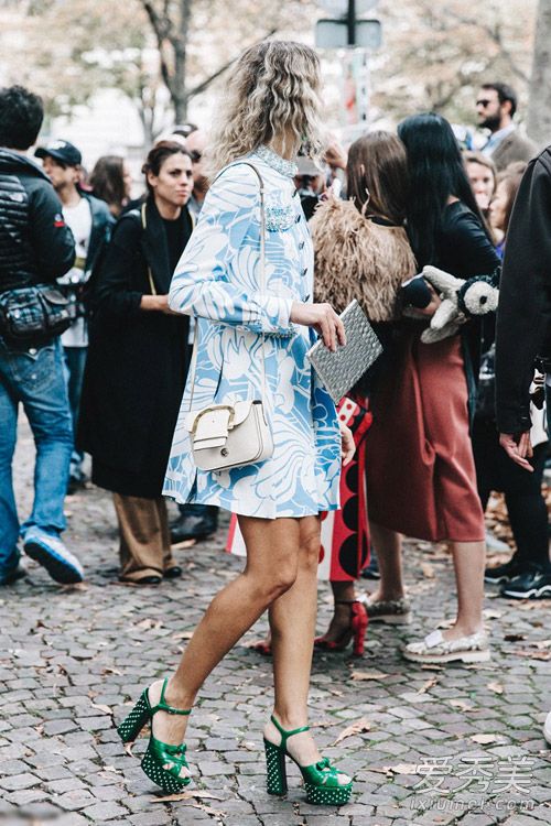 藍底白花的印花外套清新極了,就像春天的晴空一樣,藍天白云妙不可言,搭配綠色高跟鞋和白色包包,滿滿都是春日氣息。