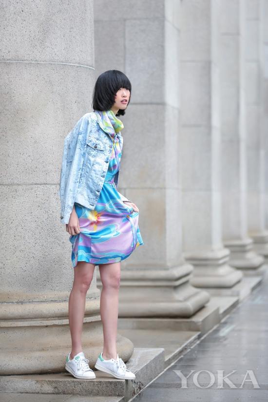 模特伍靜麗身著Leonard真絲針織印花裙搭配丹寧外套
