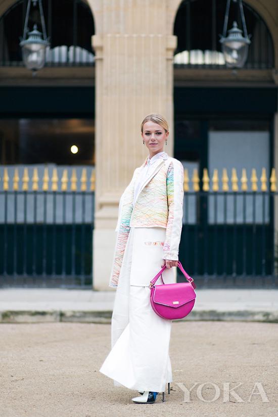 博主Sandra Kleine Staarman身上這件Leonard印花裙,狂放不羈的藝術筆觸渲染出飽和度極高的抽象印花,搭配濃郁深厚的暗調上衣與高跟鞋,顯得極為時髦、高級。不落窠臼的法式優雅,散發著令人陶醉的女人味。比起Sandra波普風格的濃艷重彩,同為抽象印花也可穿出淡雅風格,博主MarynaKovaltchuk用剪裁精良的Leonard像素印花短外套搭配曳地白色長裙,清新典雅,含蓄端莊,古典精致的造型宣告出街頭的自我個性。