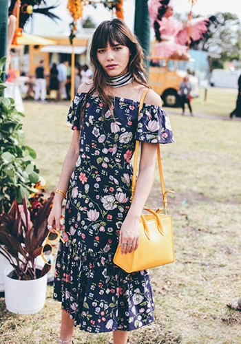 浪漫清新的印花連衣裙,采用時下最熱的一字領元素,多了不少性感風情和女人味,系一條條紋絲巾,多了些復古韻味。