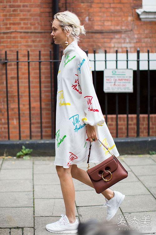 白色長(zhǎng)袖連衣裙搭配小白鞋,用彩色字母印花裝飾,童趣的涂鴉風(fēng)格,清新甜美,很Q哦。