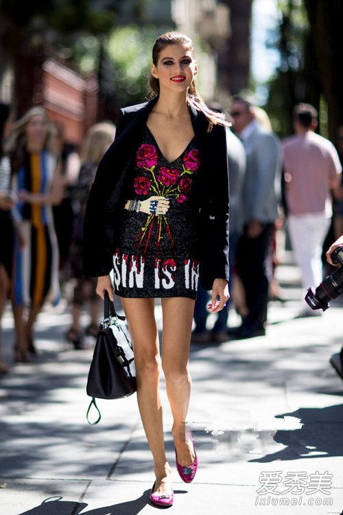 江一燕用黑色皮夾克配淺紫色印花連衣裙,踩著尖頭高跟鞋,非常優(yōu)雅淑女,帥氣的外套穿出個(gè)性。