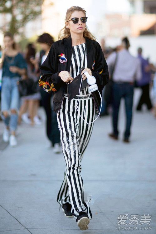 帥氣的休閑夾克加入刺繡元素后,變得時(shí)尚又精致,搭配黑白豎條紋連體褲,真的很有氣場(chǎng)。