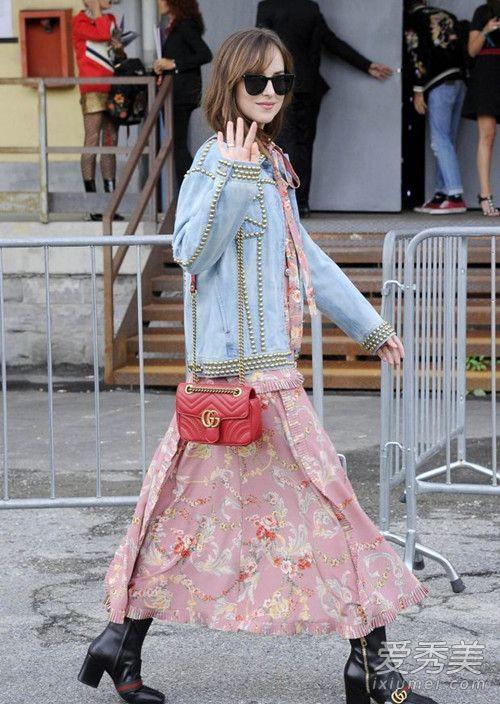 牛仔外套配印花連衣裙,印花長(zhǎng)裙給秋天注入浪漫風(fēng)情,配各種外套都是極美的。