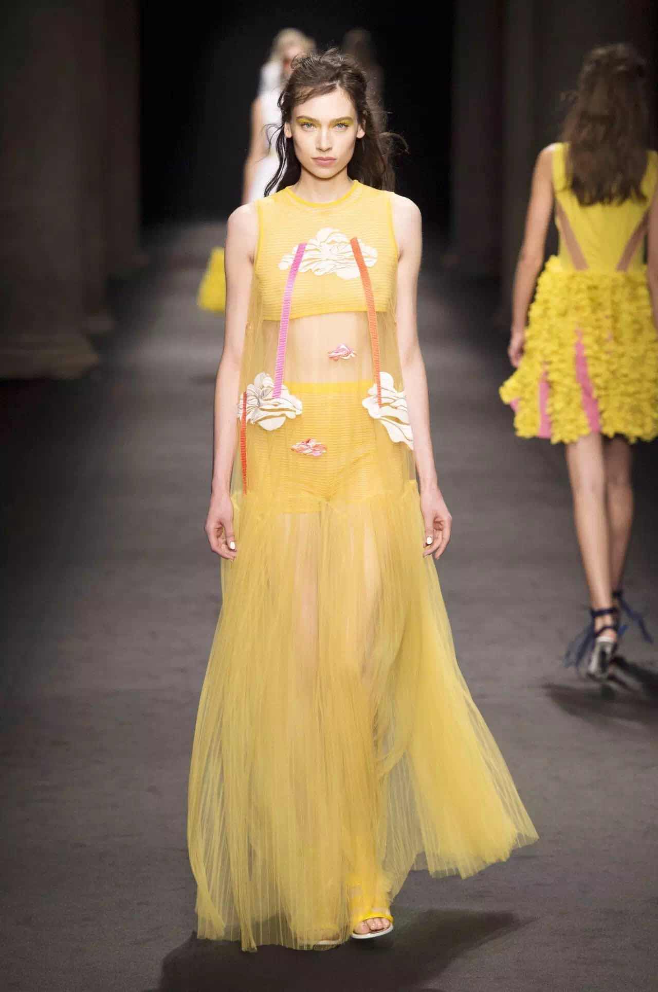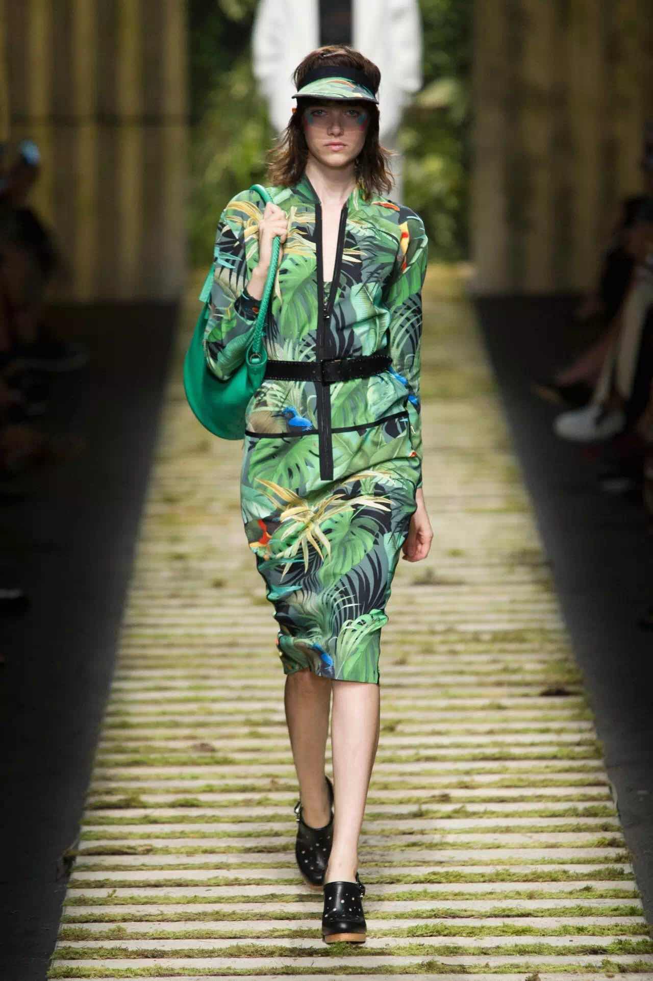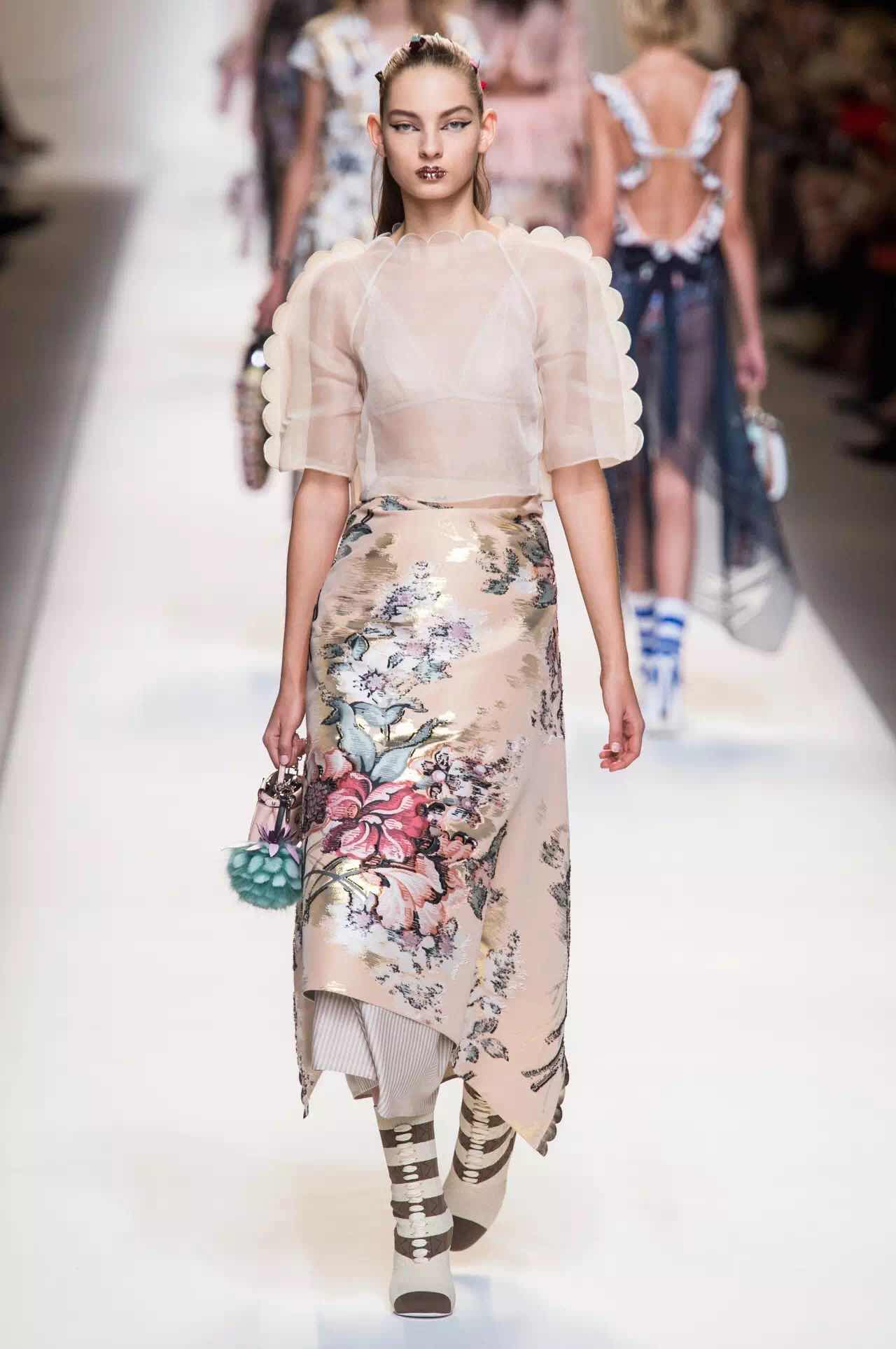 花卉依然是春夏季的關鍵花紋,米蘭時裝周上依然是百花齊放的熱鬧場面,不過值得關注的是,在這里所有的花卉都像是被進行了夸張版本的放大,設計師們運用芙蓉花卉和棕櫚葉花紋向該主題致敬。Ports 1961將五彩繽紛的大朵花卉作為設計的重中之重,也為原先的深色調添加了幾分明艷;Fendi是將花卉以工筆畫的方式勾勒于裙身上,在淺粉色調的基礎上有著浪漫的情調;Max Mara的棕櫚葉紋成為了套裝的招牌,飽和度極高的綠色,是春夏活力的代表。