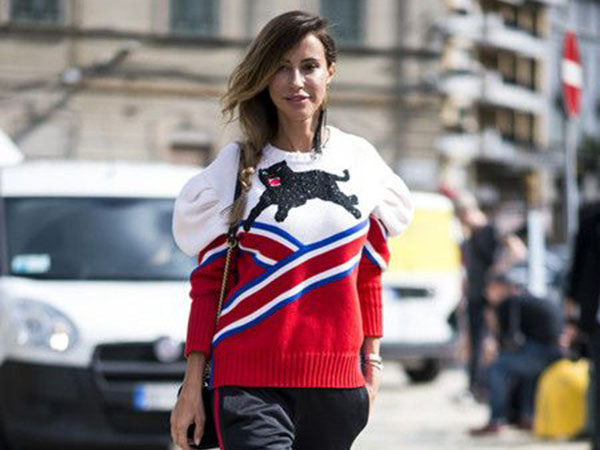 動物圖案印花毛衣,紅白拼色設計,俏皮活潑,穿在身上更顯精氣神,搭配今年側(cè)邊條紋運動褲和高跟鞋,輕松穿出完美身材。