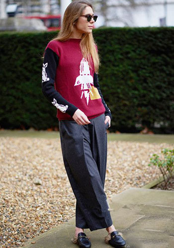 拼色印花毛衣,紅黑顏色,經(jīng)典不敗,搭配寬松九分褲,踩著今年很流行的毛毛平底鞋,吸晴時髦,讓你溫暖有型。