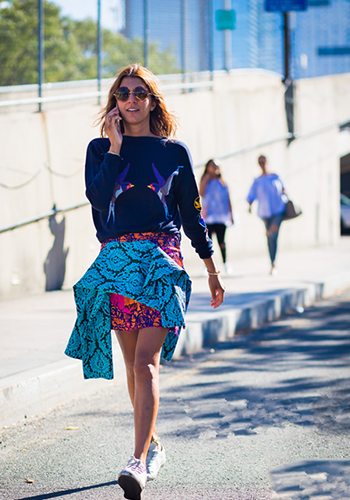 短款設計的印花毛衣搭配印花包臀裙,大秀美腿,穿上白色球鞋,更是利落清新,輕松減齡,呈現(xiàn)少女感。