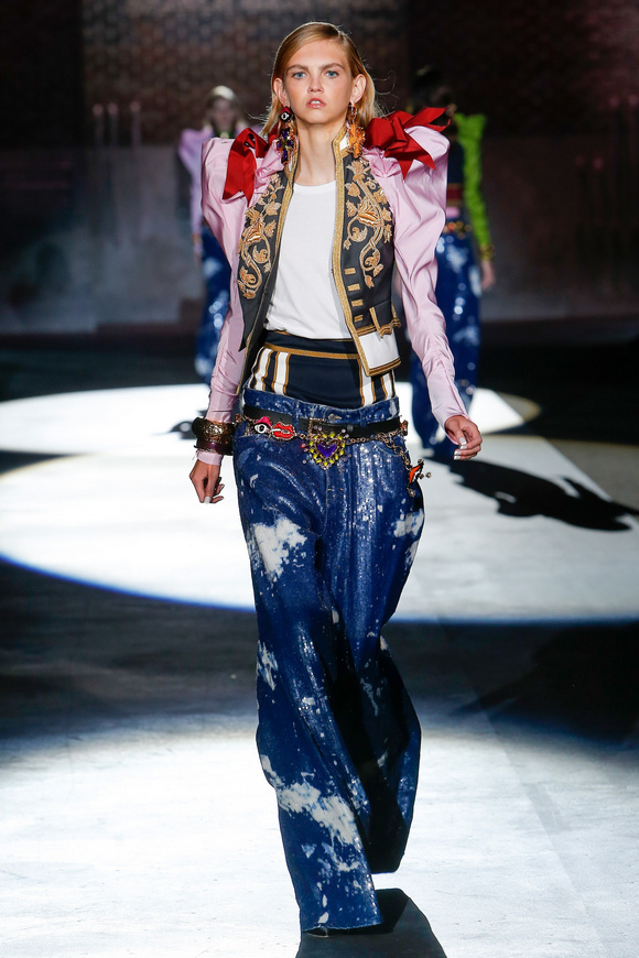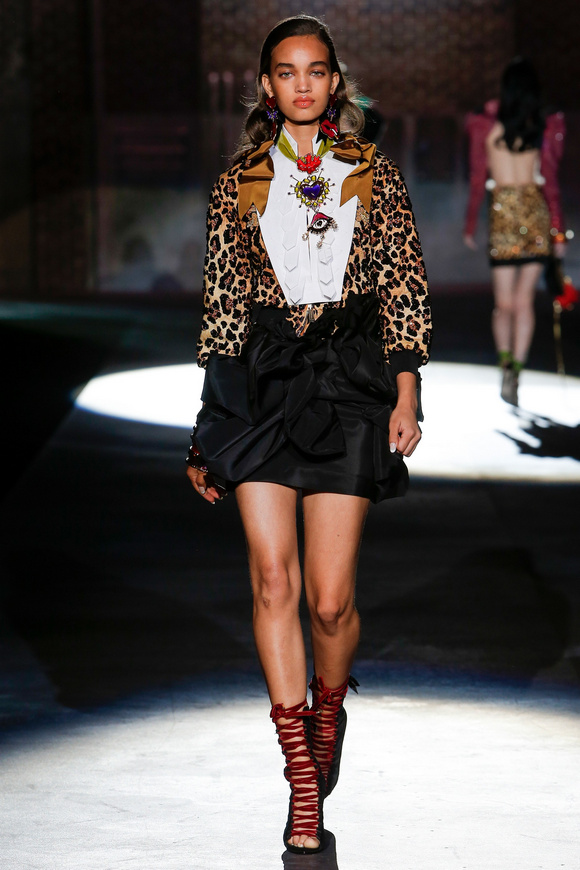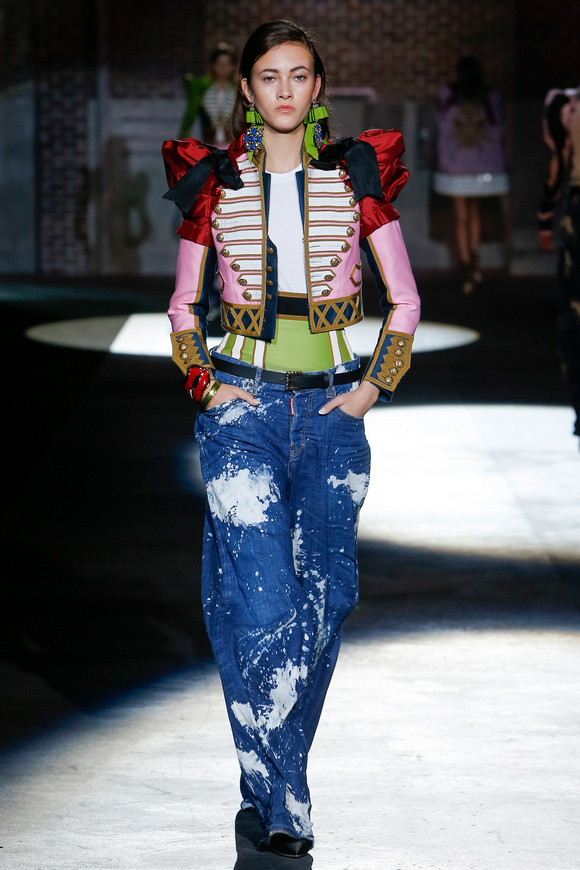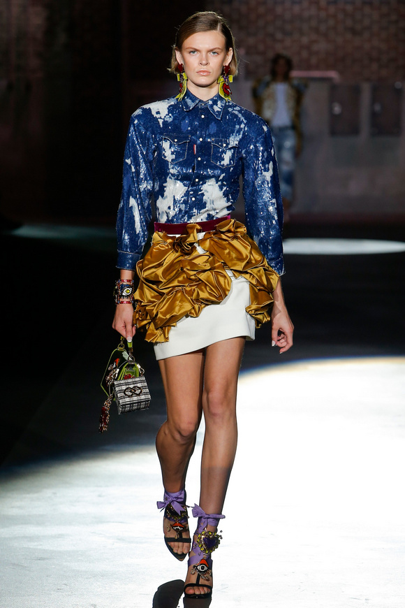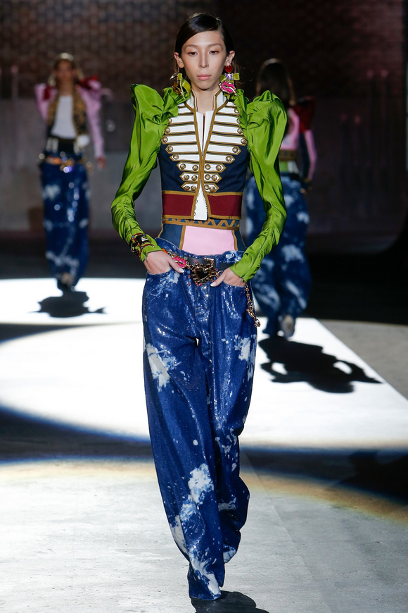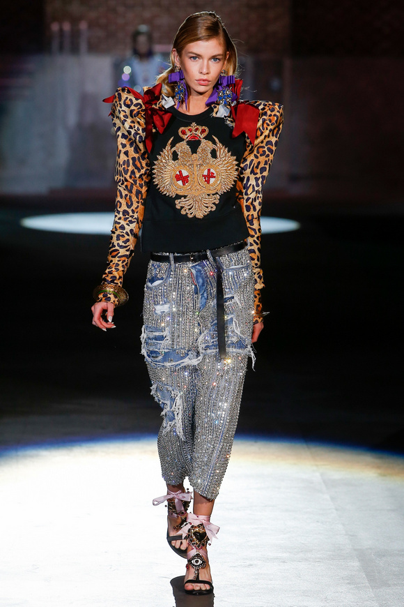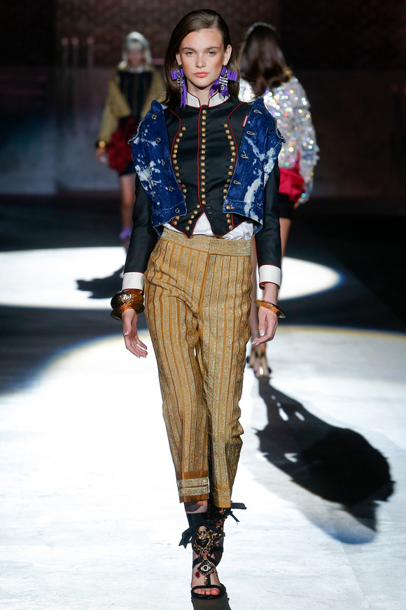 Dsquared2 的設計師Dean和Dan Caten跨越音樂、歌劇,把牛仔褲、亮片、施華洛世奇水晶、豹紋和羊腿袖幾何在一起。讓人想起King Ottokar的權杖。因此,有時候一個塔夫綢散落的迷你裙,或者軍事條紋羊毛褲,它們共同點都是無限的變化有趣但夸大的主題。跨度在其中發揮到了極致。