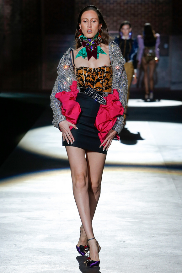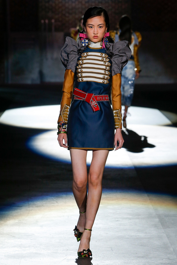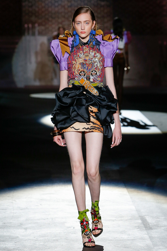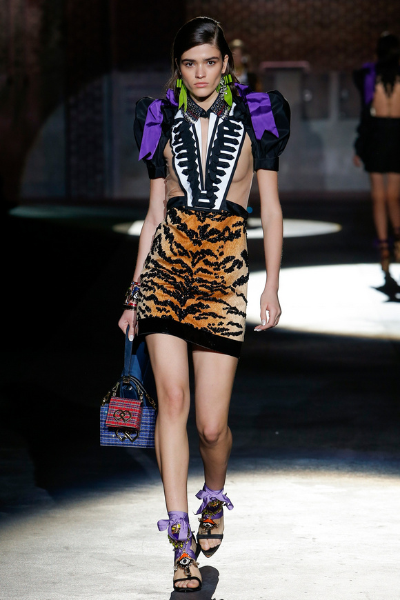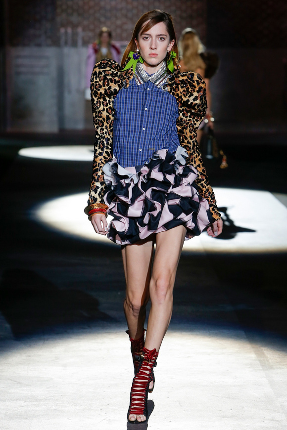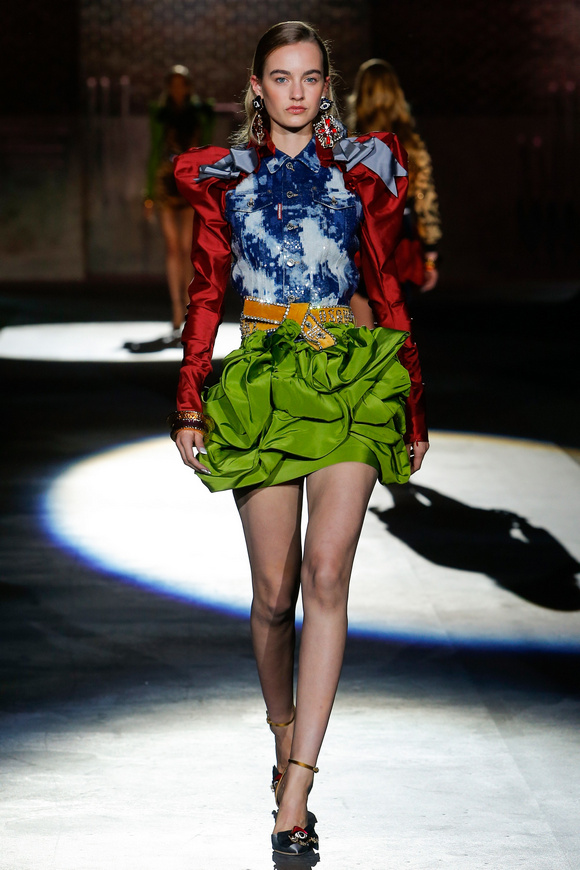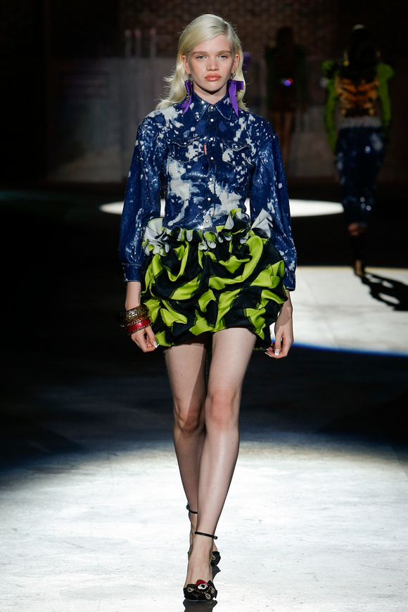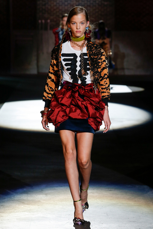 Dsquared2 的設計師Dean和Dan Caten跨越音樂、歌劇,把牛仔褲、亮片、施華洛世奇水晶、豹紋和羊腿袖幾何在一起。讓人想起King Ottokar的權杖。因此,有時候一個塔夫綢散落的迷你裙,或者軍事條紋羊毛褲,它們共同點都是無限的變化有趣但夸大的主題。跨度在其中發揮到了極致。