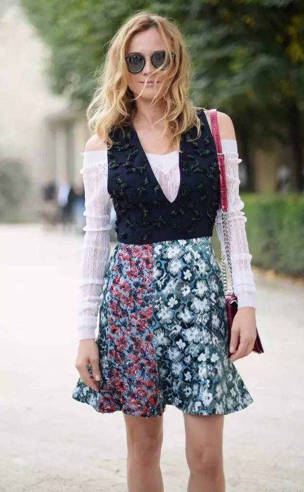 印花單品之所以容易給人廉價感,除了圖案比較復雜外,還在于風格太過甜膩,顯得不夠大氣耐看。因此你可以對癥下藥,搭配一些材質挺括的中性單品,一方面中和了慣有的甜膩,提升造型質感,還可以讓你又美又帥,盡展多面魅力。
