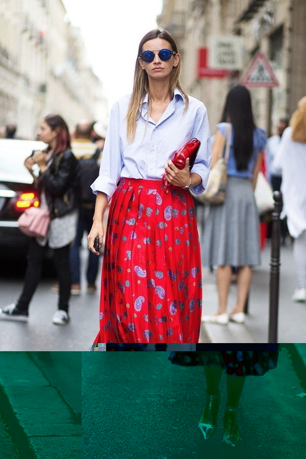 也可以選擇帶有顏色卻足夠清爽的藍襯衫與印花裙作搭配,搭出更出彩的撞色效果。