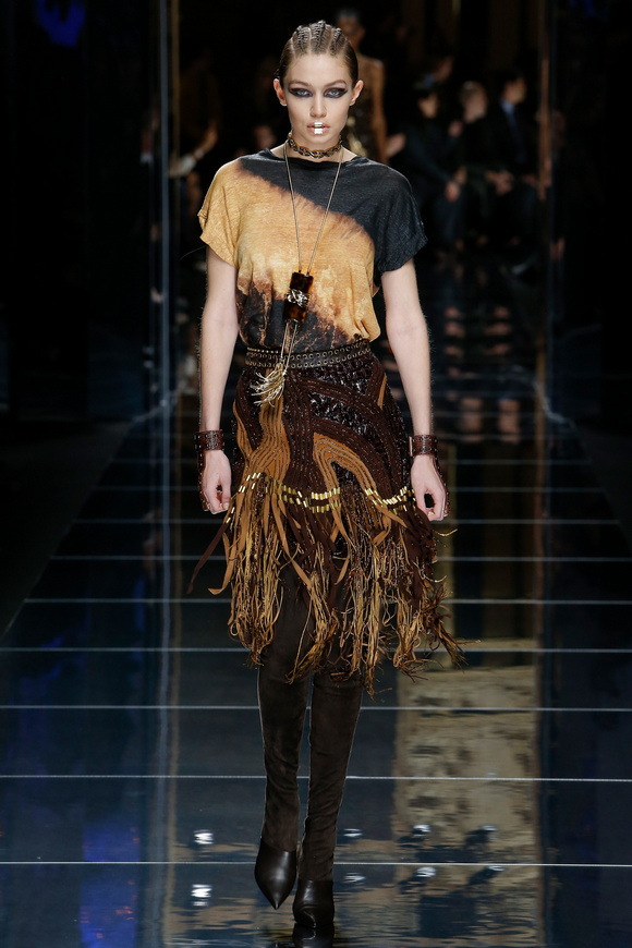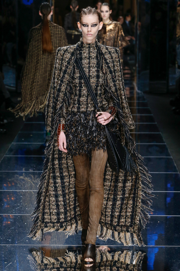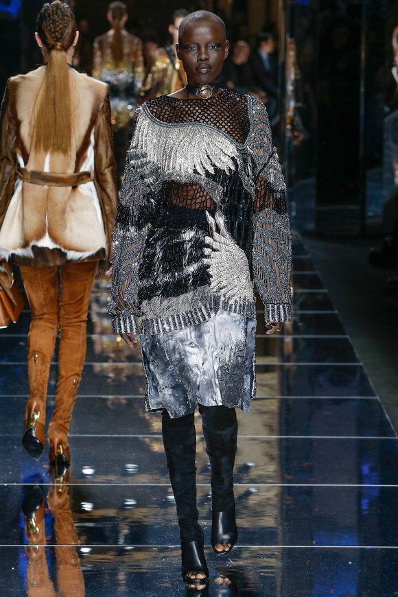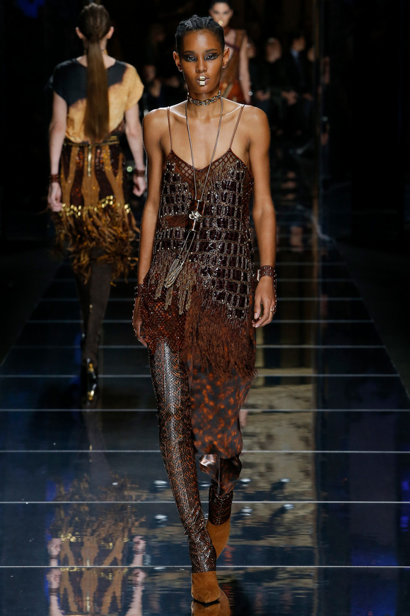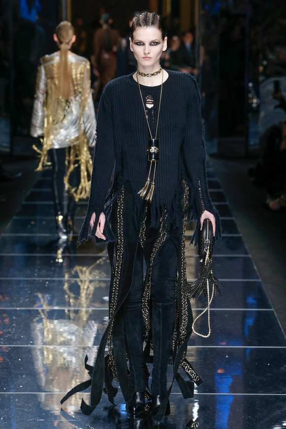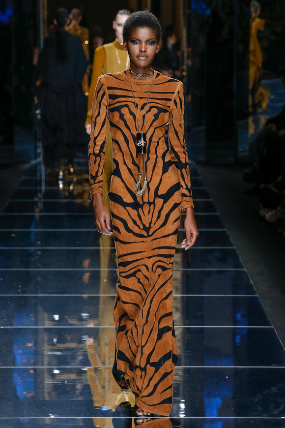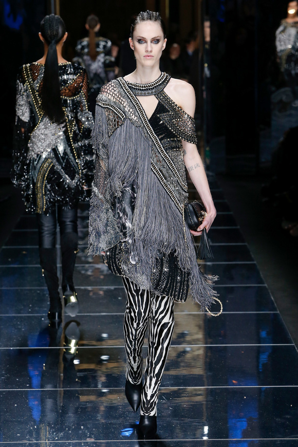 Balmain 巴爾曼的設(shè)計(jì)信念從來(lái)都沒(méi)有動(dòng)搖過(guò),就是廣泛的包容性,超越各色人種。在這一季,Balmain成功開(kāi)發(fā)男裝系列,對(duì)于男裝,也采用了超緊,超短并搭配金鏈子、石榴石串、一季磨砂金亮片。在其他方面,注重顏色的運(yùn)用,黑色、棕色、金色。朦朧的數(shù)碼印花、海馬毛的針織、超大的無(wú)袖羊毛背心外套、蛇皮花紋、扎染的裙子。這一季的設(shè)計(jì)真的令人目不暇接。