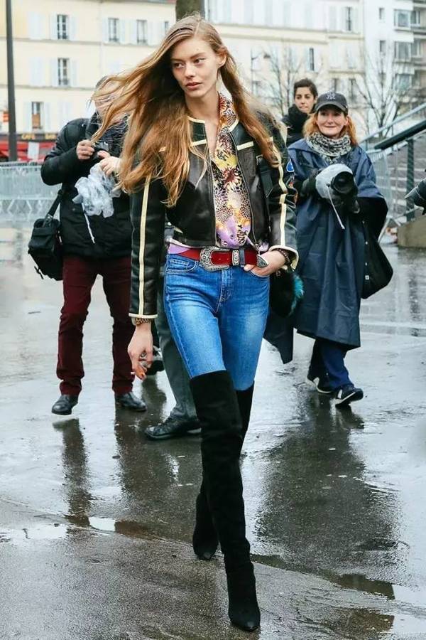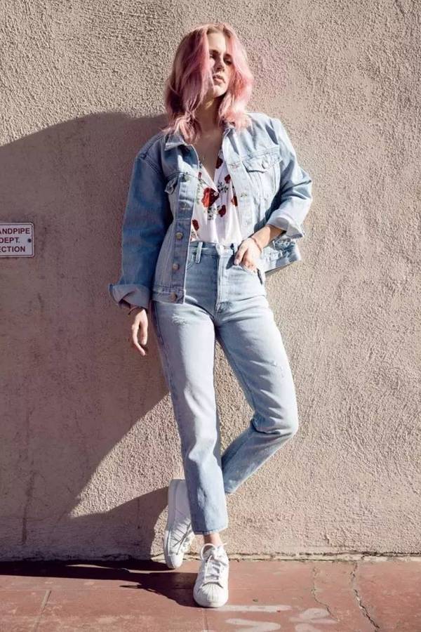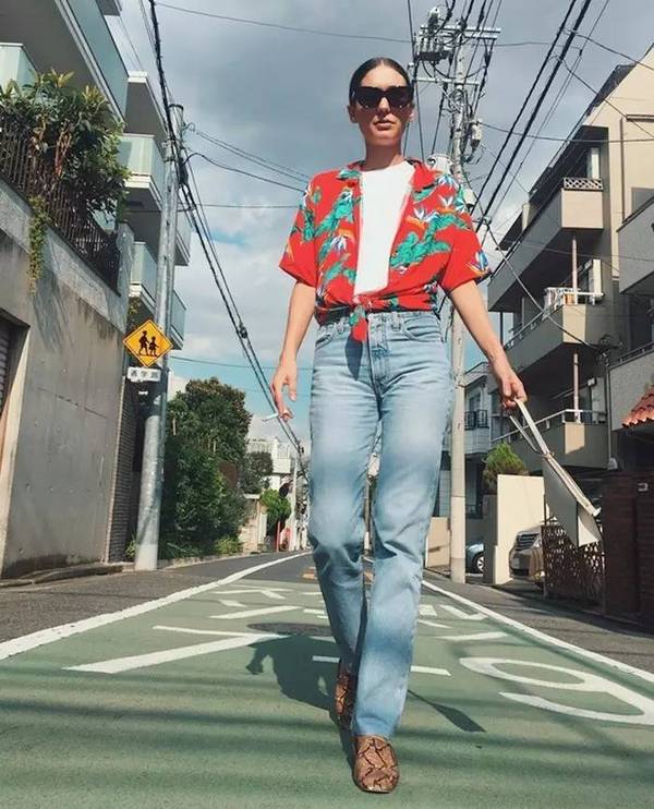 博主Courtney Trop演繹無袖印花襯衫搭配牛仔夾克