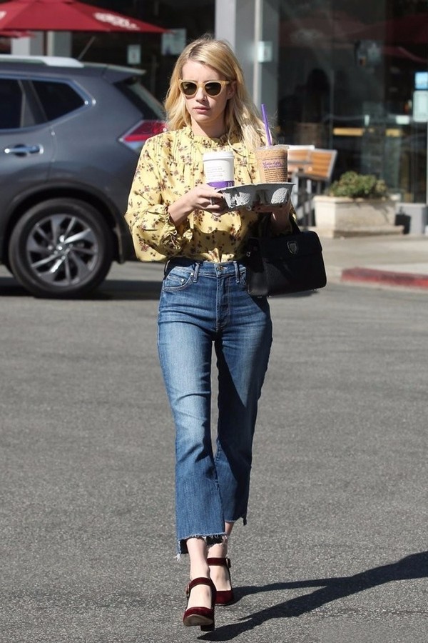 艾瑪middot;羅伯茨出街演繹印花襯衫搭配撕邊牛仔褲