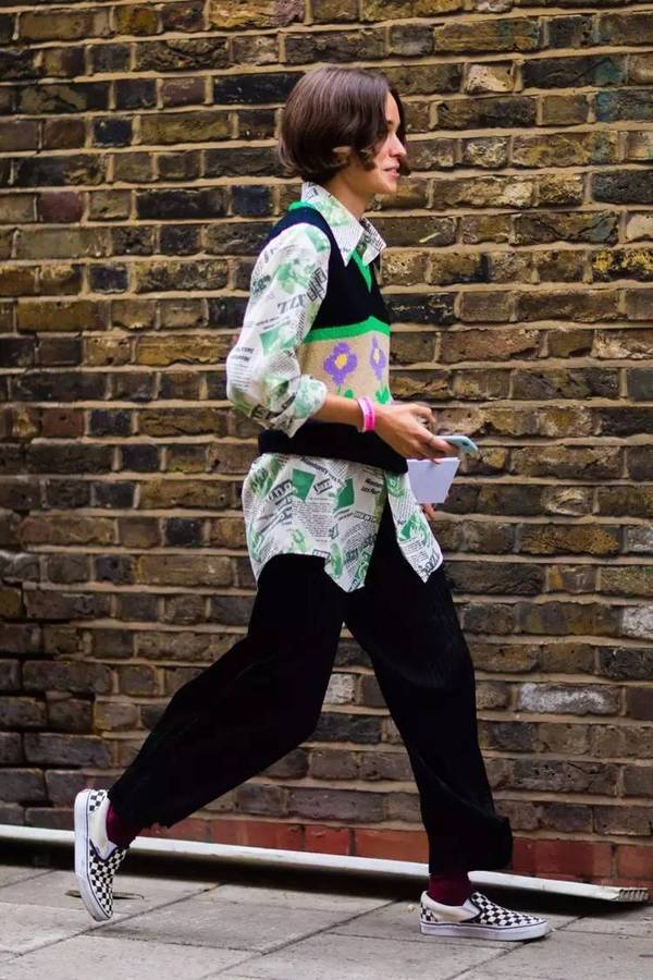 模特Lili Sumner街拍演繹印花襯衫搭配格紋長褲