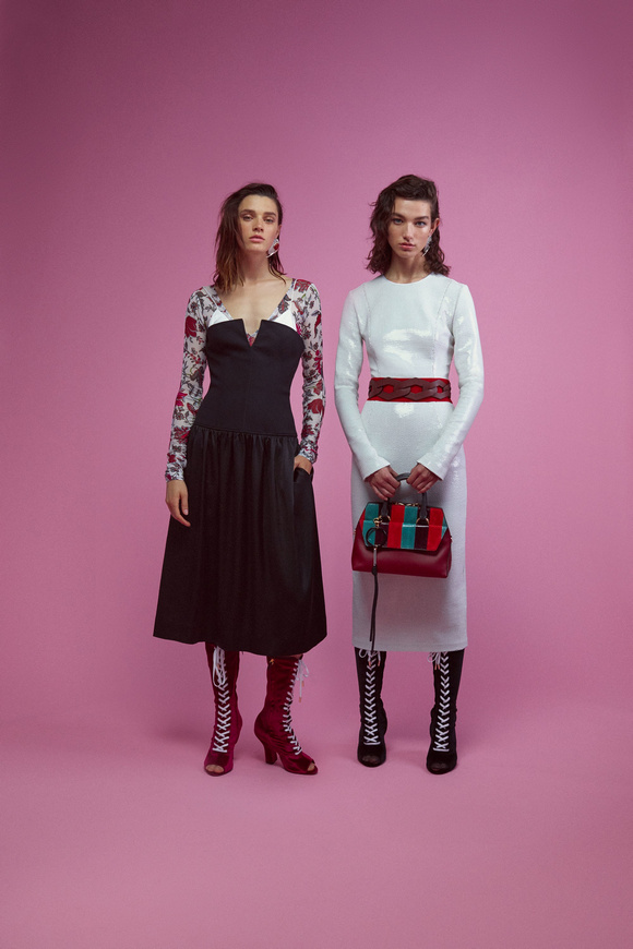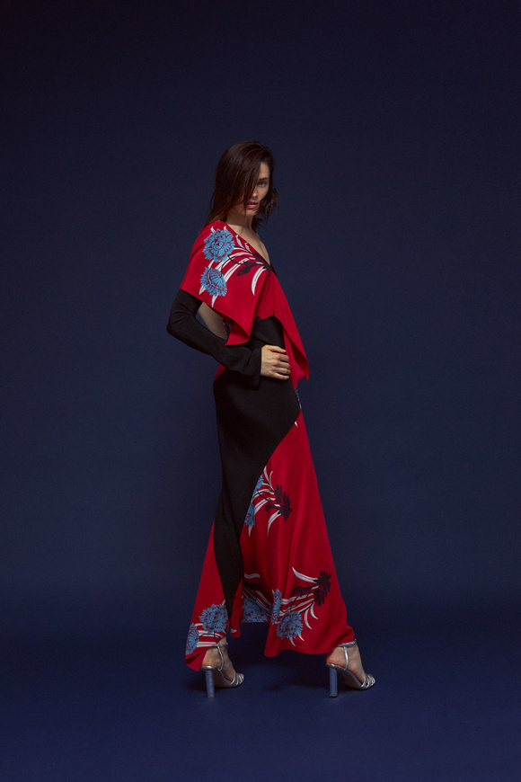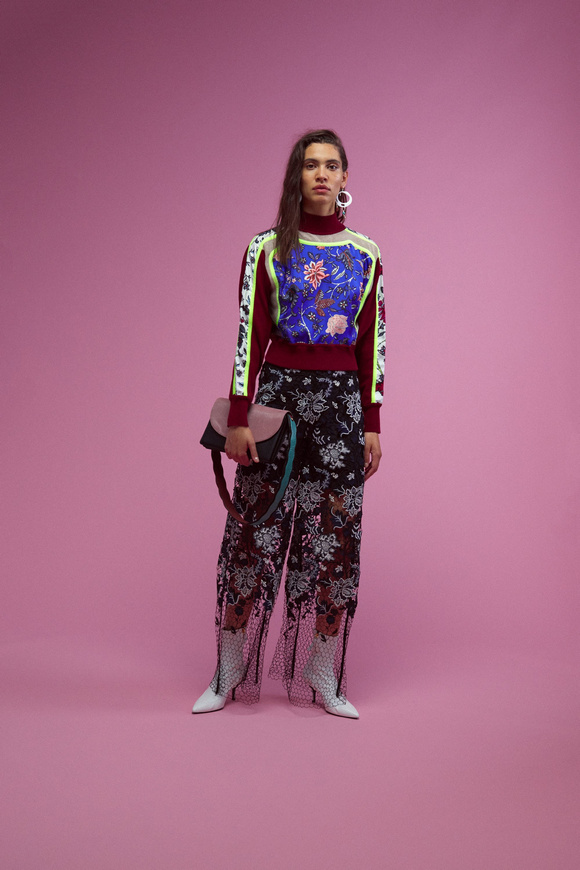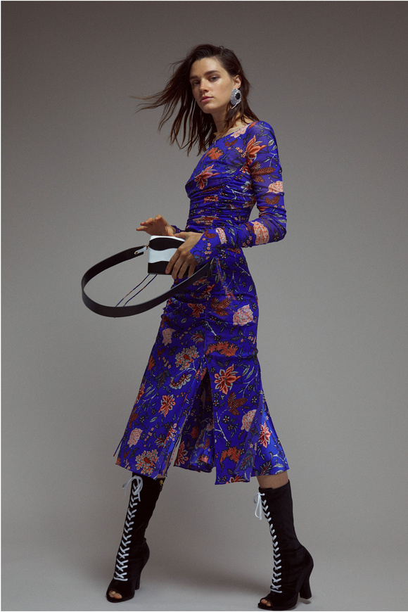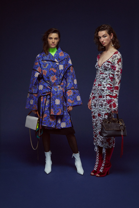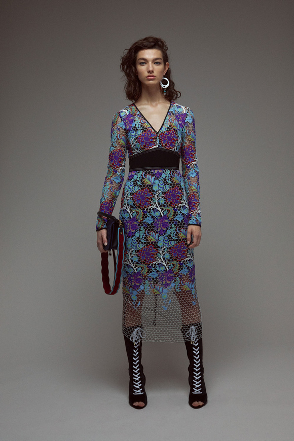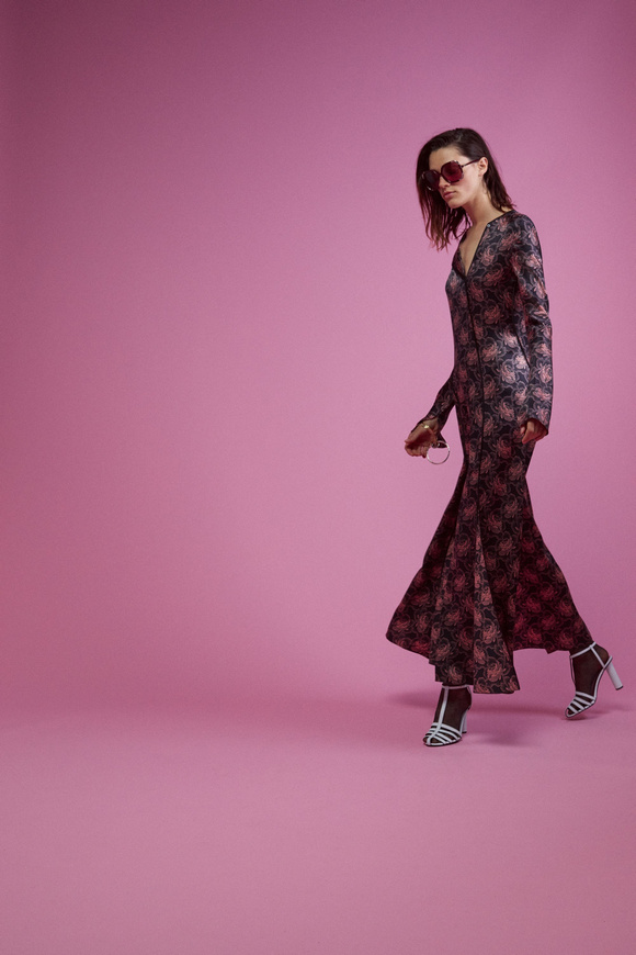 Diane von Furstenberg的設(shè)計(jì)師Scotsman Jonathan Saunders從一開始,他已經(jīng)把時(shí)尚融入到他斜裁的印花連衣裙里。結(jié)合黑色和桃色的粉紅色調(diào)。分層印花。他確實(shí)有很多面料的開發(fā),其中最引人注目的是他想出這款Lurex手繪點(diǎn)打印。