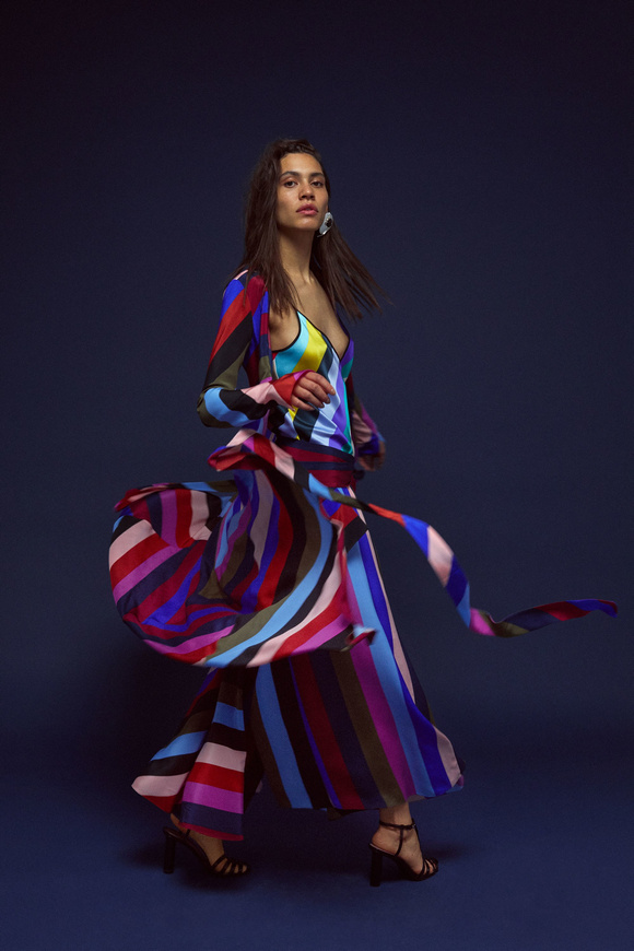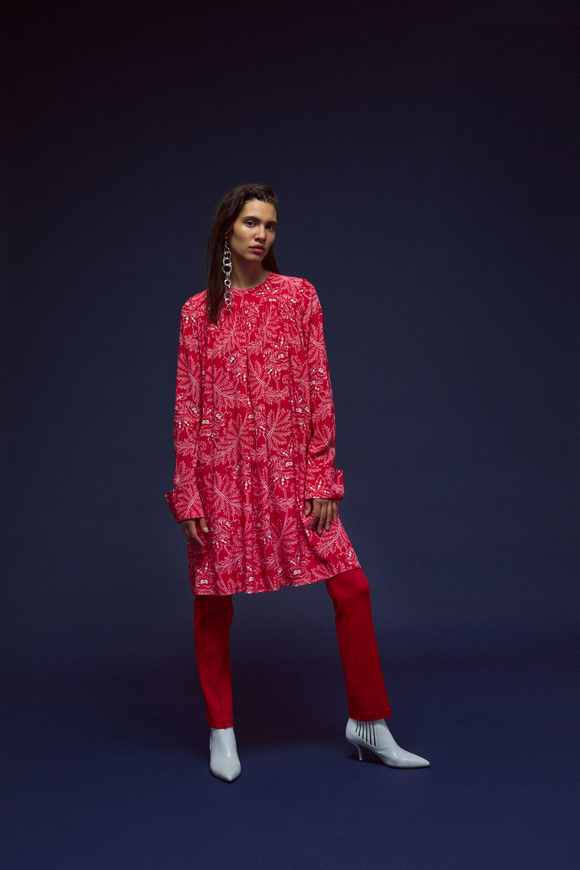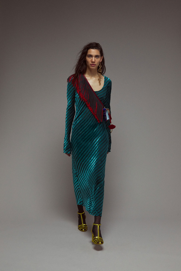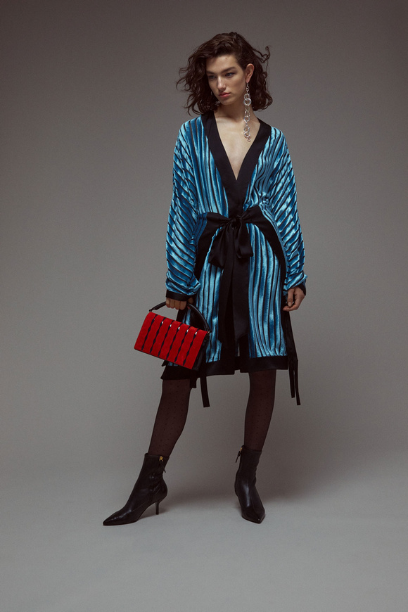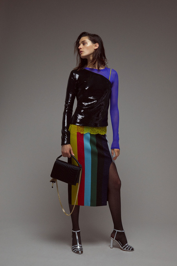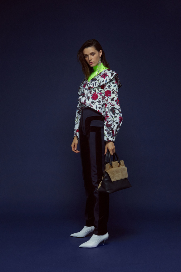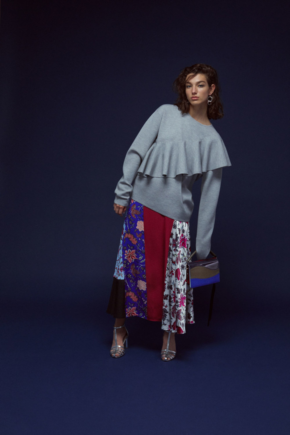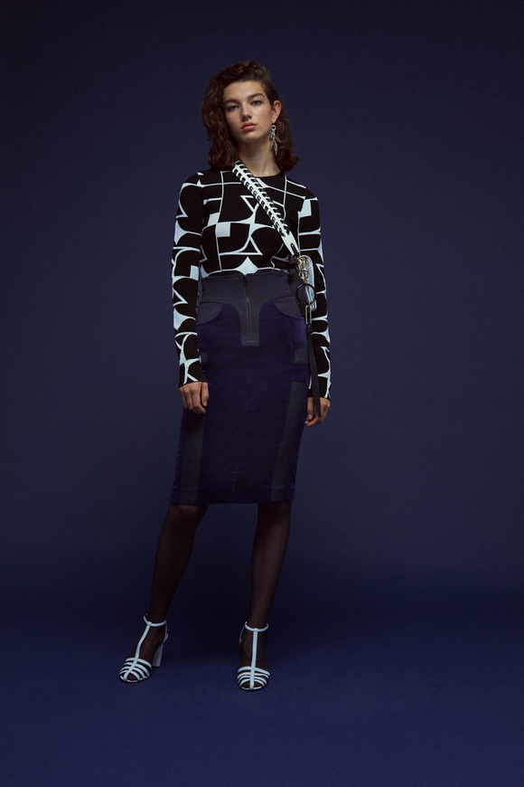 Diane von Furstenberg的設(shè)計(jì)師Scotsman Jonathan Saunders從一開始,他已經(jīng)把時(shí)尚融入到他斜裁的印花連衣裙里。結(jié)合黑色和桃色的粉紅色調(diào)。分層印花。他確實(shí)有很多面料的開發(fā),其中最引人注目的是他想出這款Lurex手繪點(diǎn)打印。